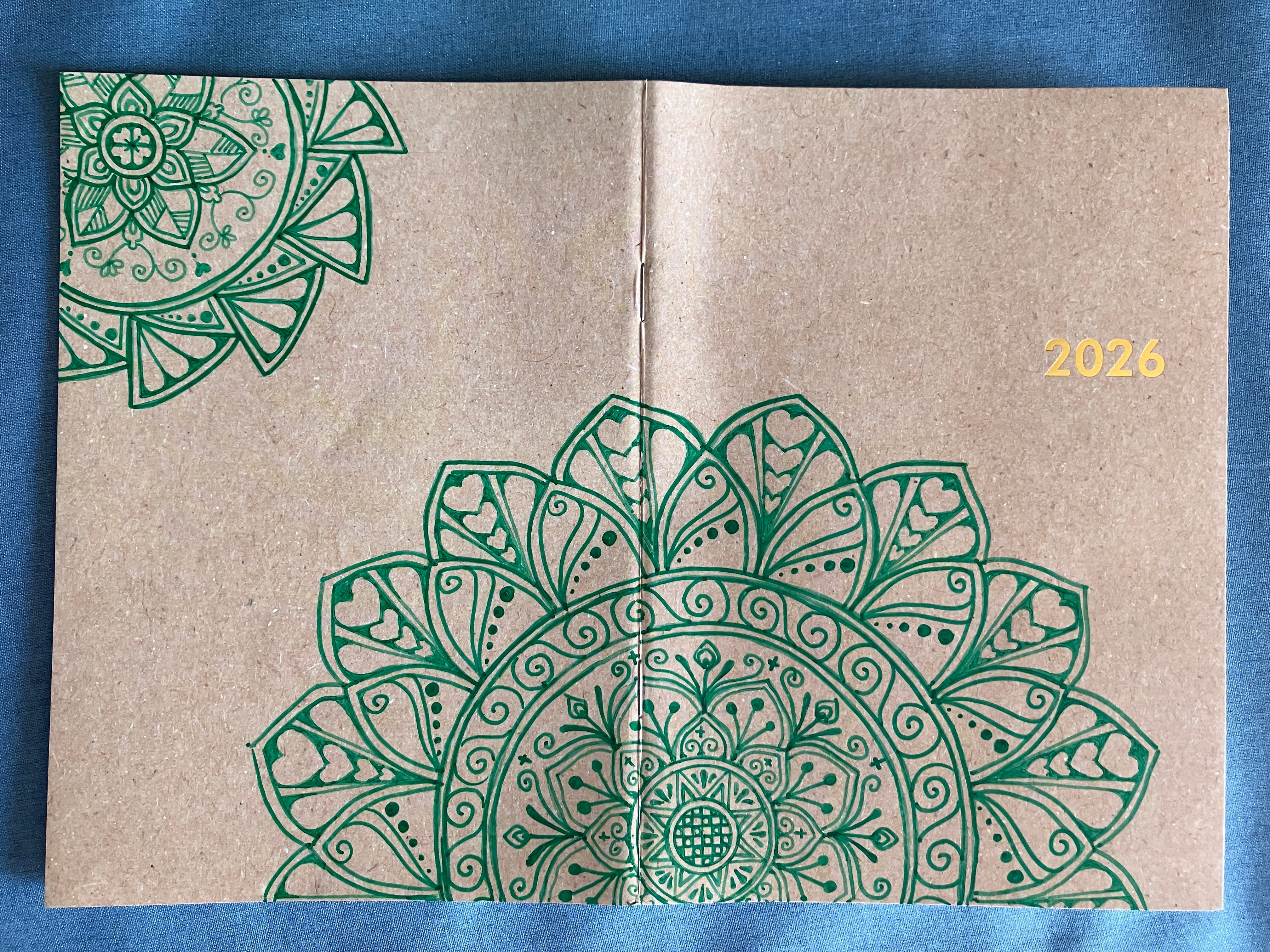 ナチュラルベージュの表紙にグリーンのペンでまんだらを描きました。ビニールのカバー付きです。