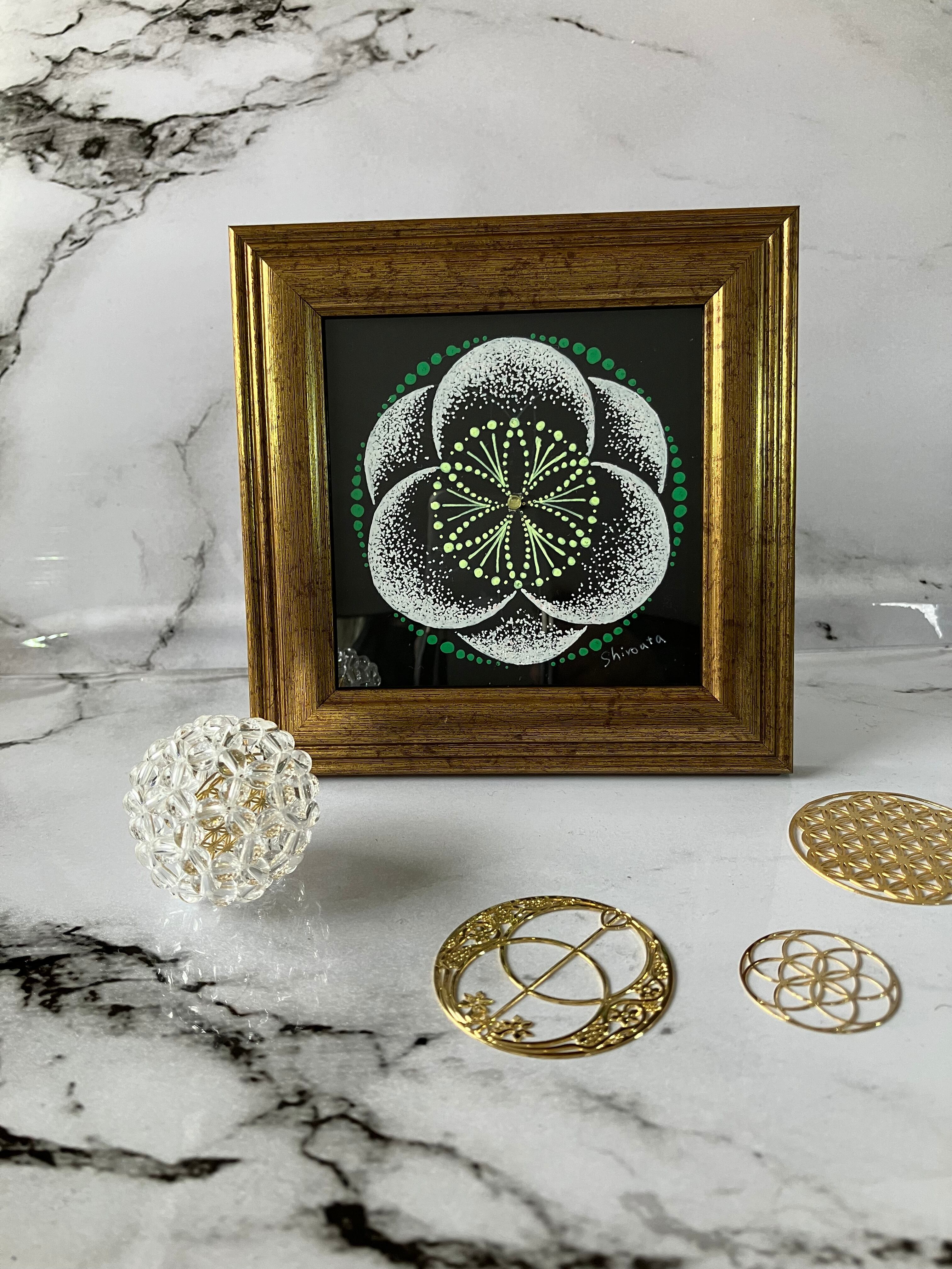 神聖幾何学をモチーフに描いた曼荼羅画には眺めるだけで直感力が育つ、自分の心や頭の中が整理され明確化される、セルフイメージが上がるなど、瞑想効果が得られると言われています。